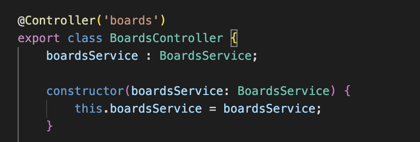 이 boardService 파라미터를 BoardsController 클래스 안에서 사용하기 위해 this.boardService 프로퍼티에 boardsService를 할당해준다.