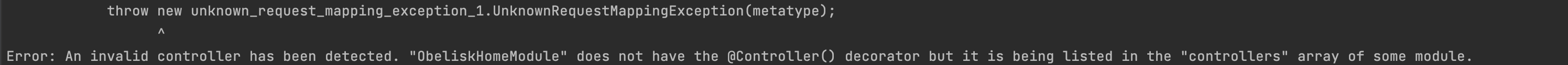 controllers: [] 부분에서 컨트롤러 이름을 작성했어야 했는데 여기에 모듈 이름을 작성해서 위와 같은 에러가 발생했던 것이었다.