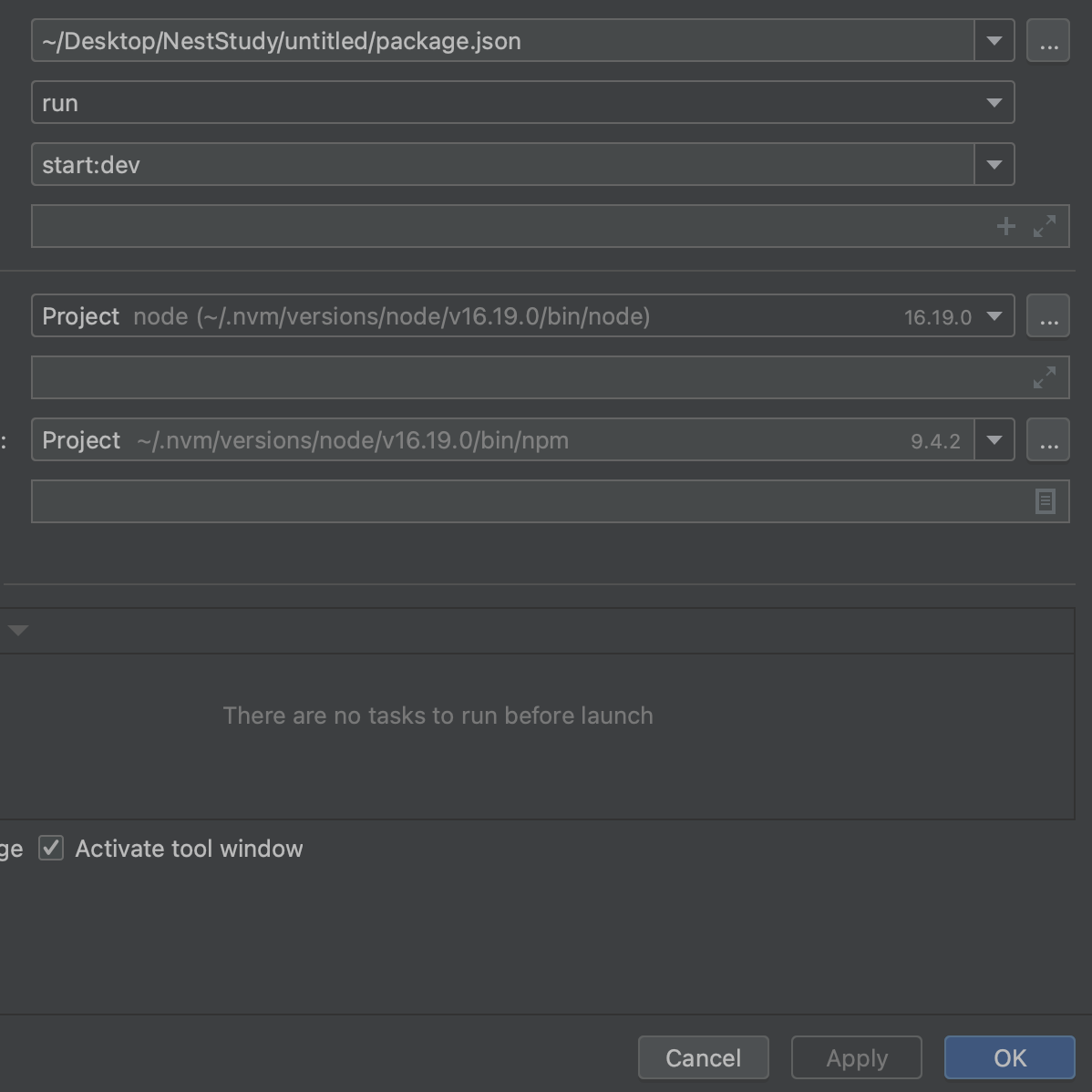 4. Run configurations 부분에서 npm 선택