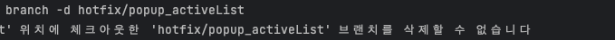 맨 위 사진을 보면 현재 브랜치의 위치가 hotfix/popup_activeList인데, 현재 checkout된 브랜치가 hotfix/popup_activeList 브랜치다. 즉 이 브랜치에서 직접 hotfix/popup_activeList 브랜치를 삭제할 수 없다는 것.