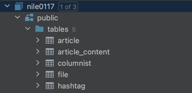 7. Database 탭에서 db연결은 잘 되었다. 이때 public의 아래방향 화살표를 눌렀을 때 아무런 테이블 정보가 뜨지 않는다면