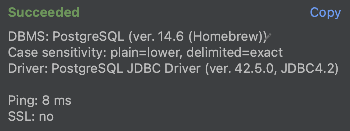 먼저 위에서 \c를 통해 DB가 잘 연결되었는지 Test Connection으로 확인한다. 연결이 잘 되었다면 아래와 같이 Succeeded 메시지가 출력된다.